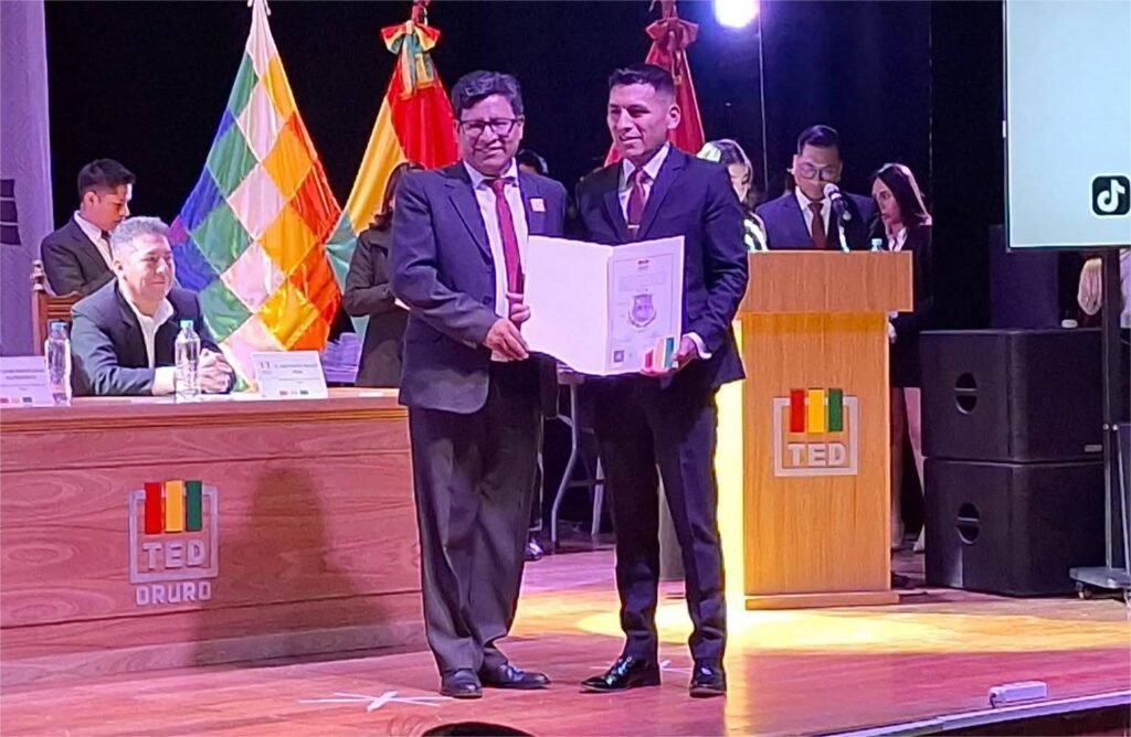El flamante gobernador Edgar Sánchez recibió su acreditación de manos del presidente del TED Oruro Hernán Chili Quispe y agradeció el apoyo ciudadano. “Hoy comienza una nueva etapa: unidad, trabajo y desarrollo para todo nuestro departamento. No venimos a prometer, venimos a cumplir”, afirmó.