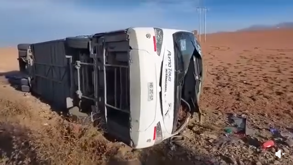 El accidente se registró alrededor de las 4:00. La unidad, un Mercedes Benz con placa chilena perteneciente a la empresa Puma Tours, salió de la vía y terminó recostado sobre su lado izquierdo.